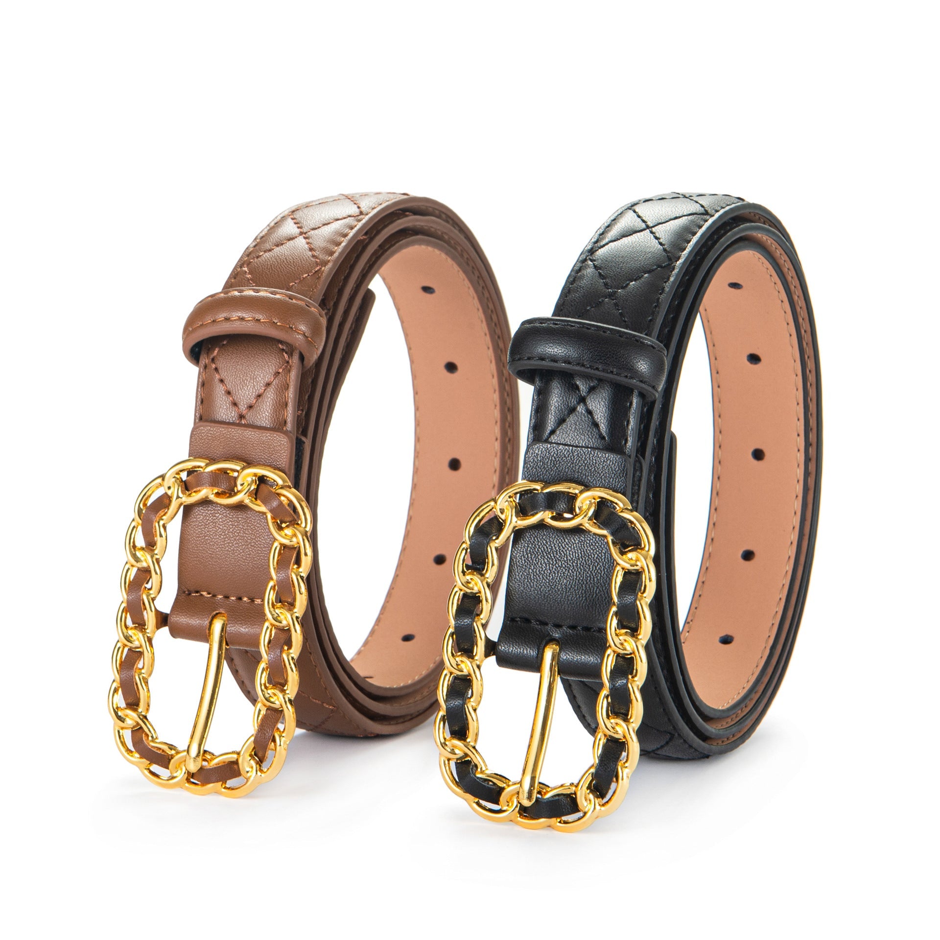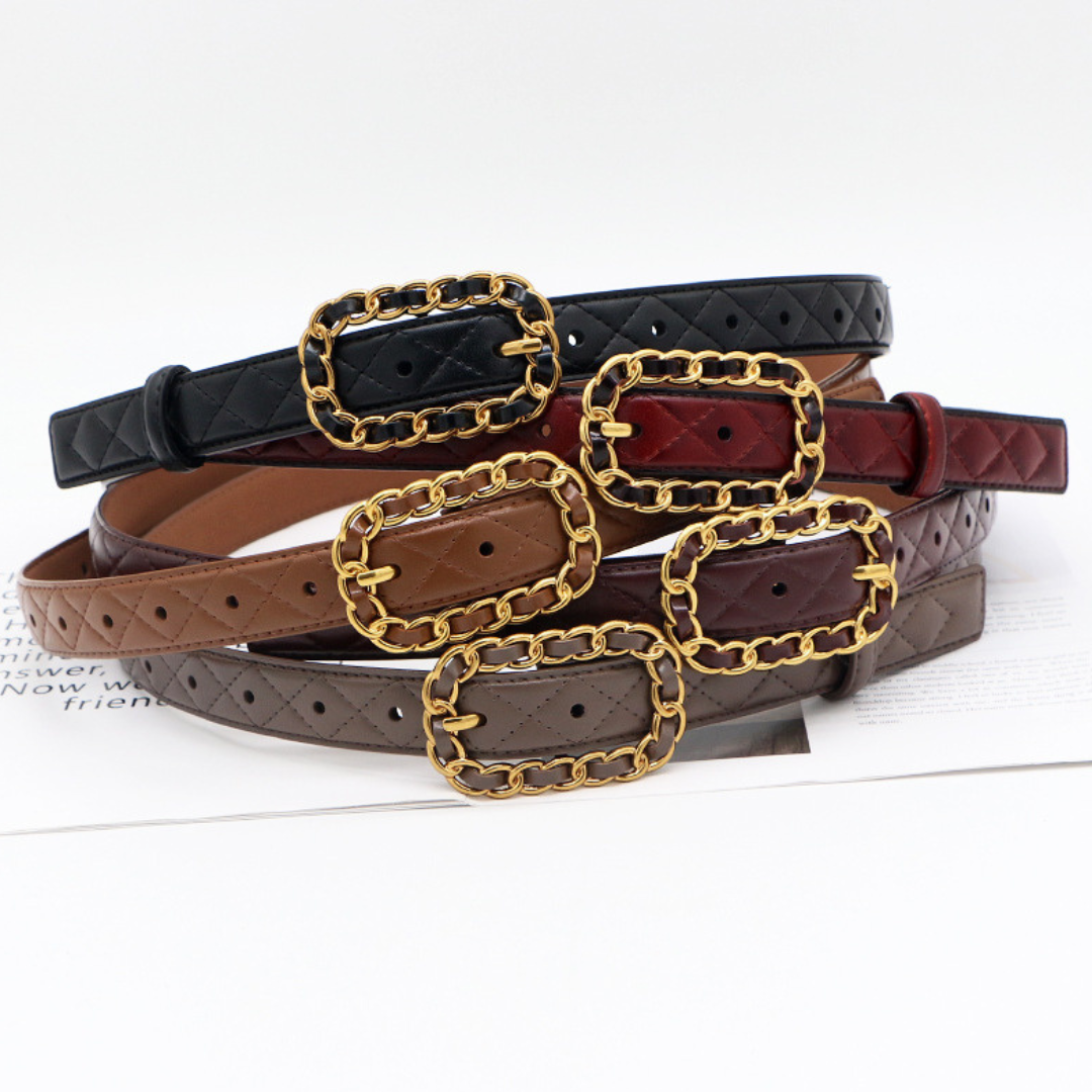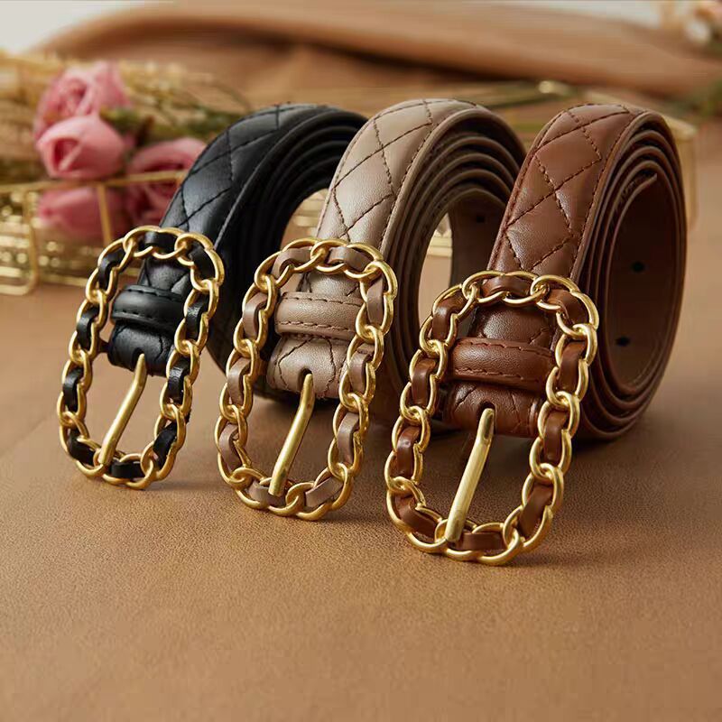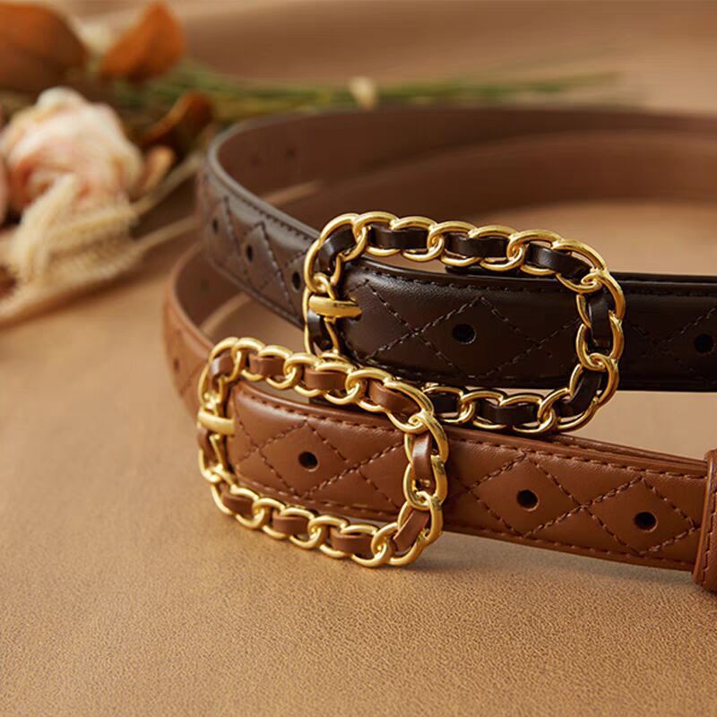 This quilted leather belt combines refined design with versatile wearability. Featuring diamond-pattern stitching and a gold-plated chain buckle, it channels 90s vintage fashion. Choose from five classic shades to complement jeans, dresses, or blazers for a polished look.
