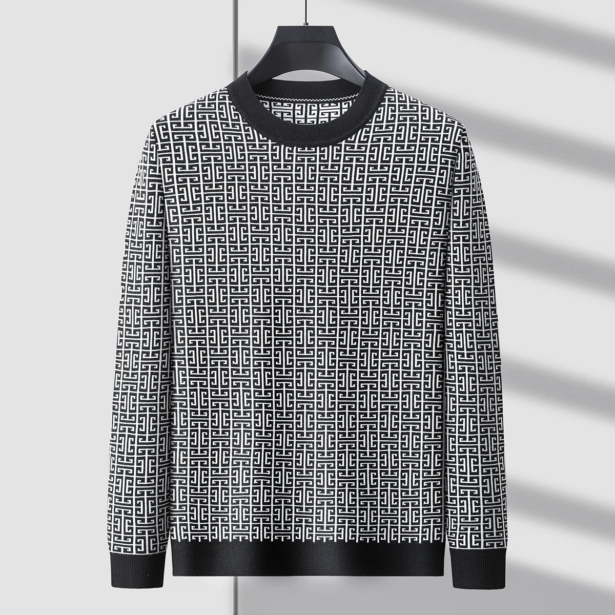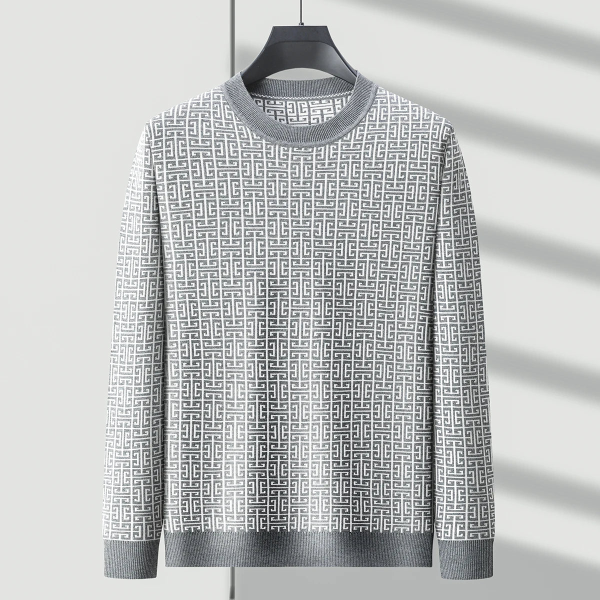 Upgrade your wardrobe with the Blake sweater, featuring a distinctive geometric maze pattern that adds a modern touch. Made from soft, breathable knit fabric with ribbed cuffs and hem, it offers comfortable warmth and a tailored fit. Ideal for layering or wearing on its own, this sweater pairs well with trousers or denim for a refined, casual look.