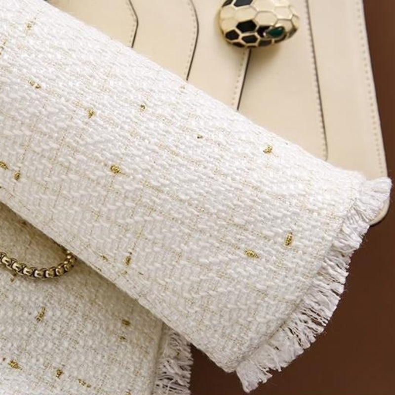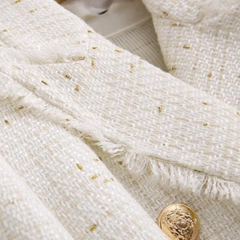 Wrapped in fierce, structured tweed, this double-breasted blazer is your secret weapon for turning heads and owning authority. Bold gold buttons strike the perfect balance between timeless class and fearless edge, while the fringed hemline demands attention. Command respect with a sharp notched collar and a sleek long cut made to shape your unstoppable presence.