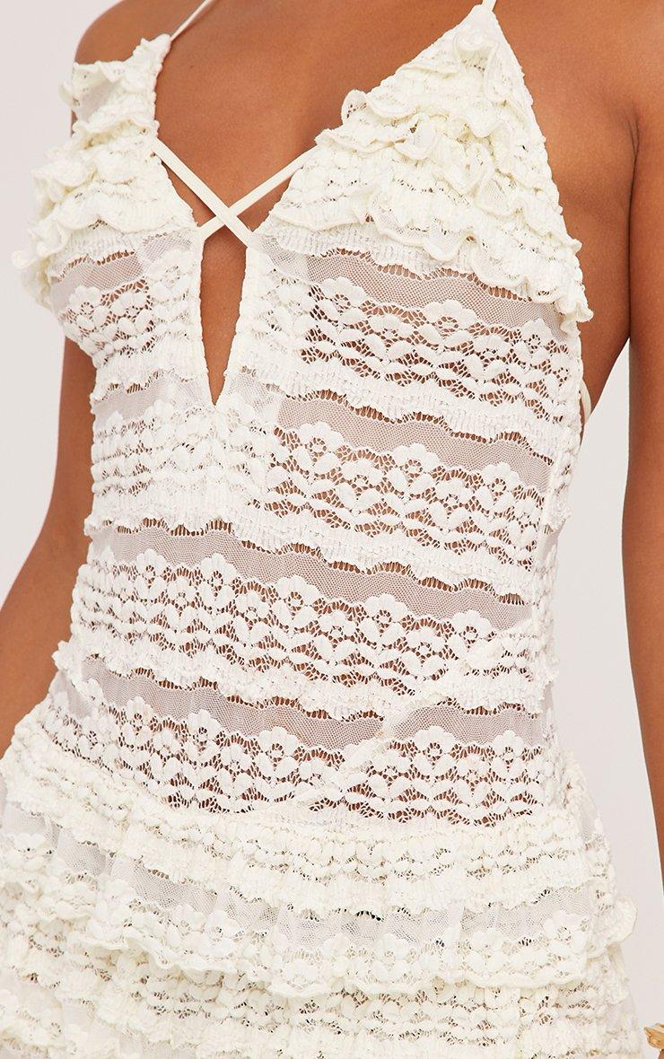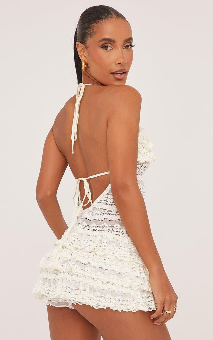 Discover the Marlenne Mini Dress in a soft cream tone with a lightweight textured fabric. This dress features a halterneck with crossed straps at the front and layers of delicate frills for added movement. Its breezy design makes it suitable for warm days, outdoor events, and relaxed weekends.