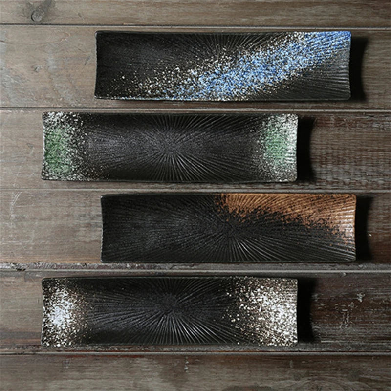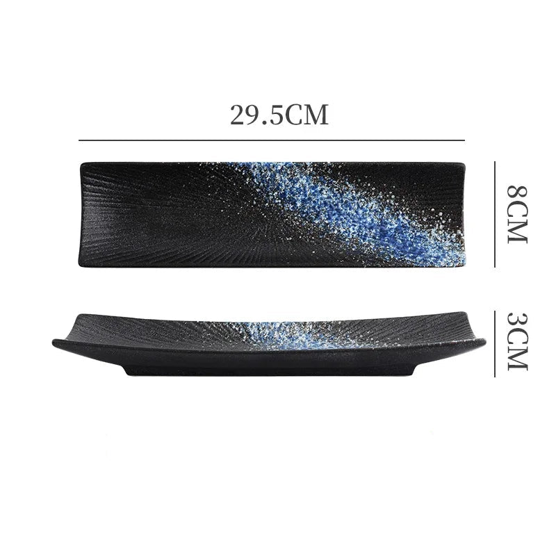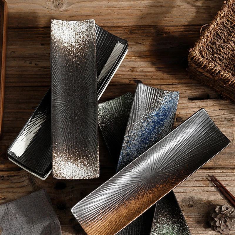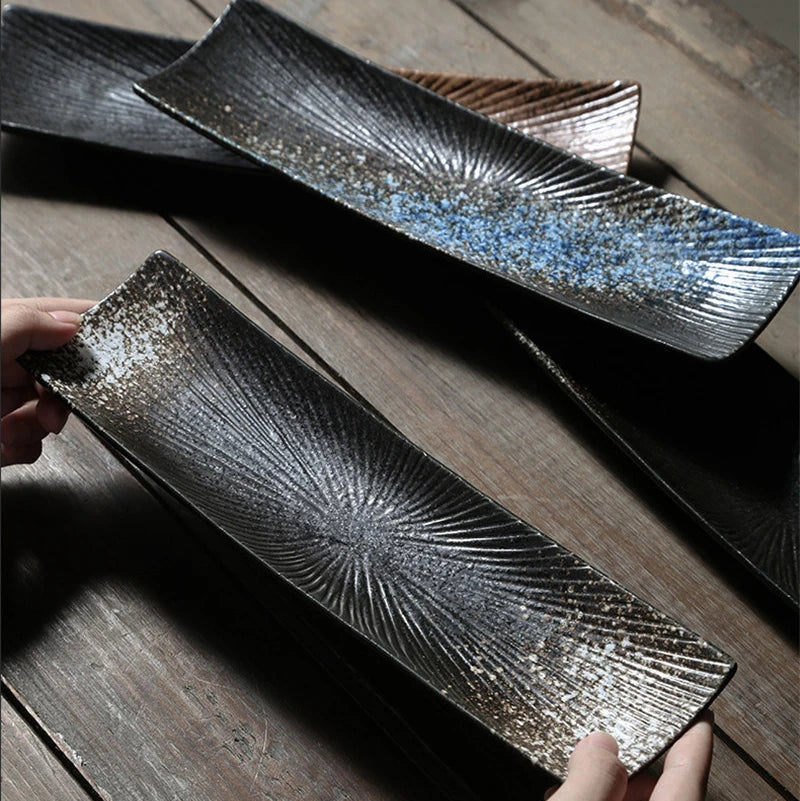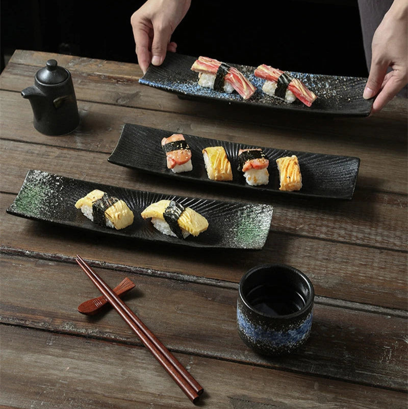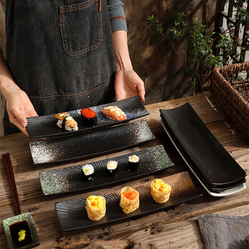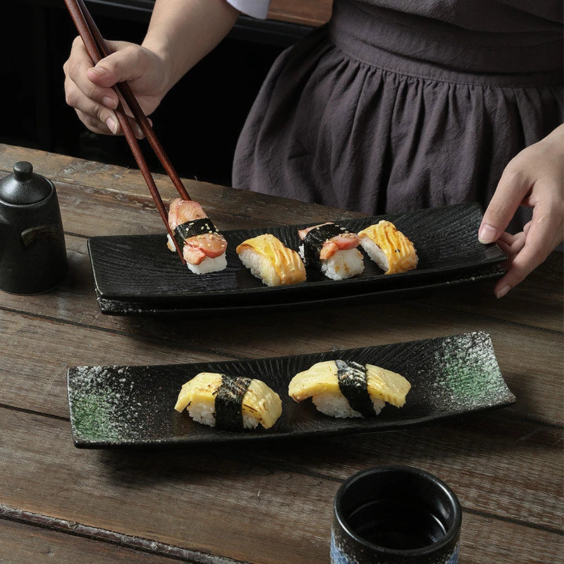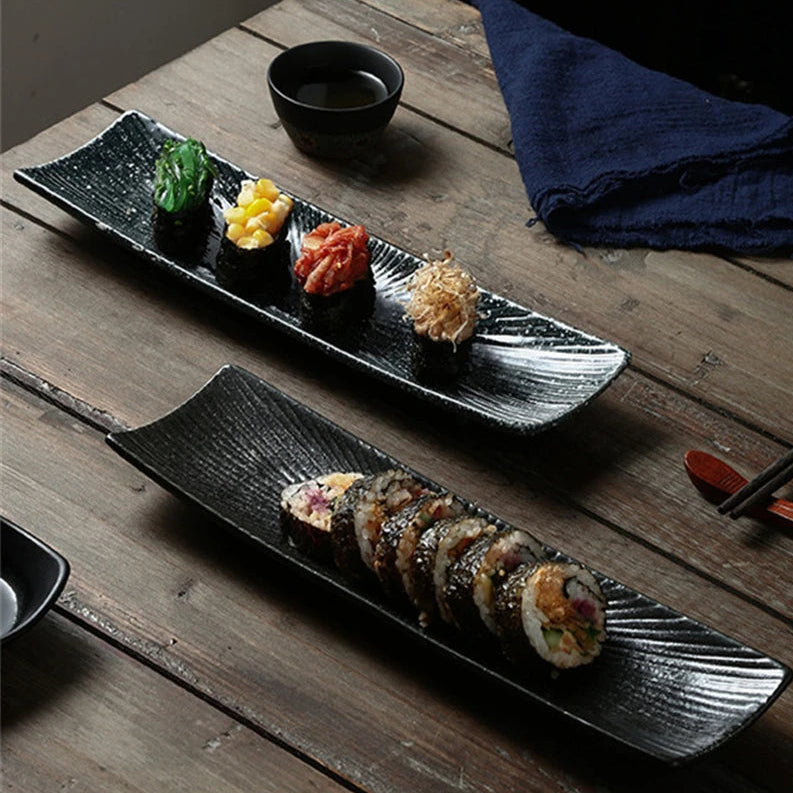 Elegant Presentation: A long rectangular ceramic plate designed to showcase sushi and sashimi with a clean, modern look that complements any meal setting.