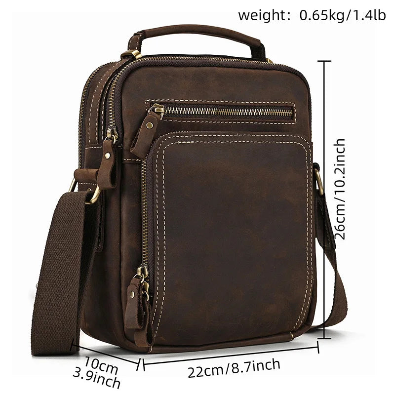 Made from genuine full-grain cow leather, this durable messenger bag combines rugged style with practical design. It fits a 9.7" iPad and keeps your essentials organized, making it suitable for work, travel, or daily outings. The bag includes multiple compartments, such as a secure back pocket and an adjustable shoulder strap, for comfort and convenience on the go.