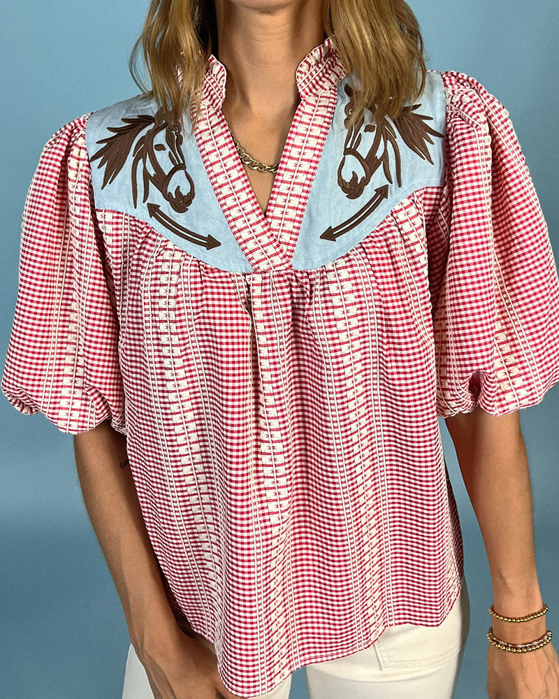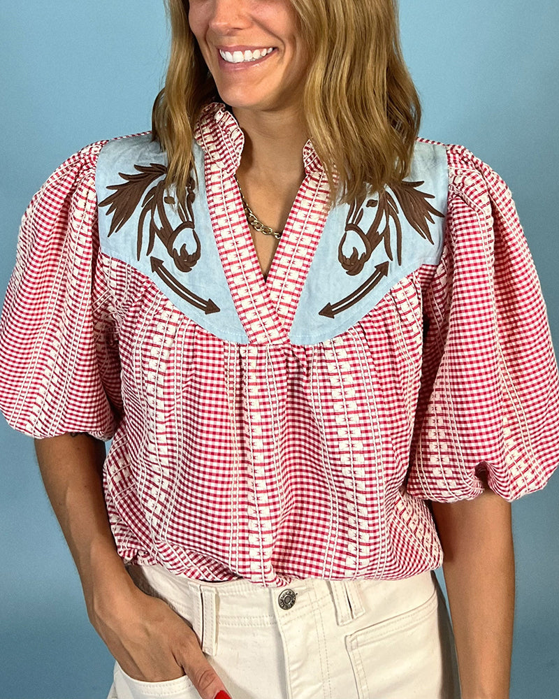 Lumea — Cotton Blend Puff Sleeve Top with Horse Embroidery