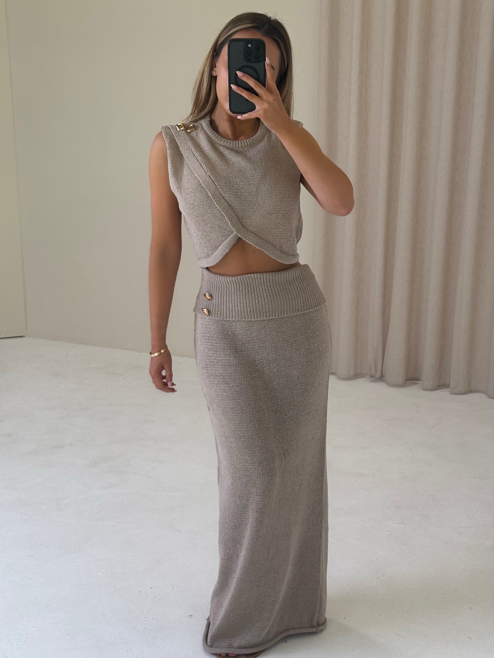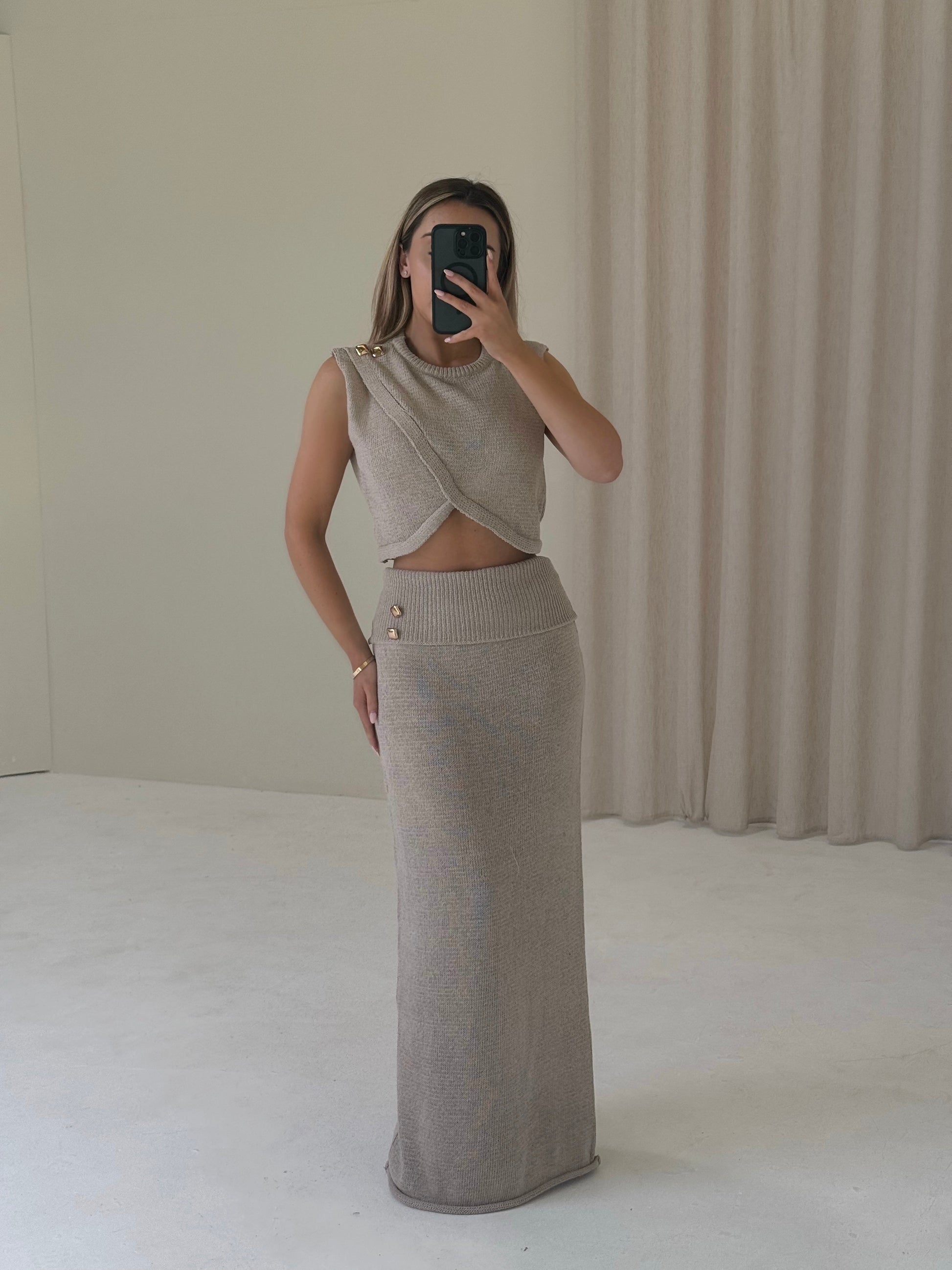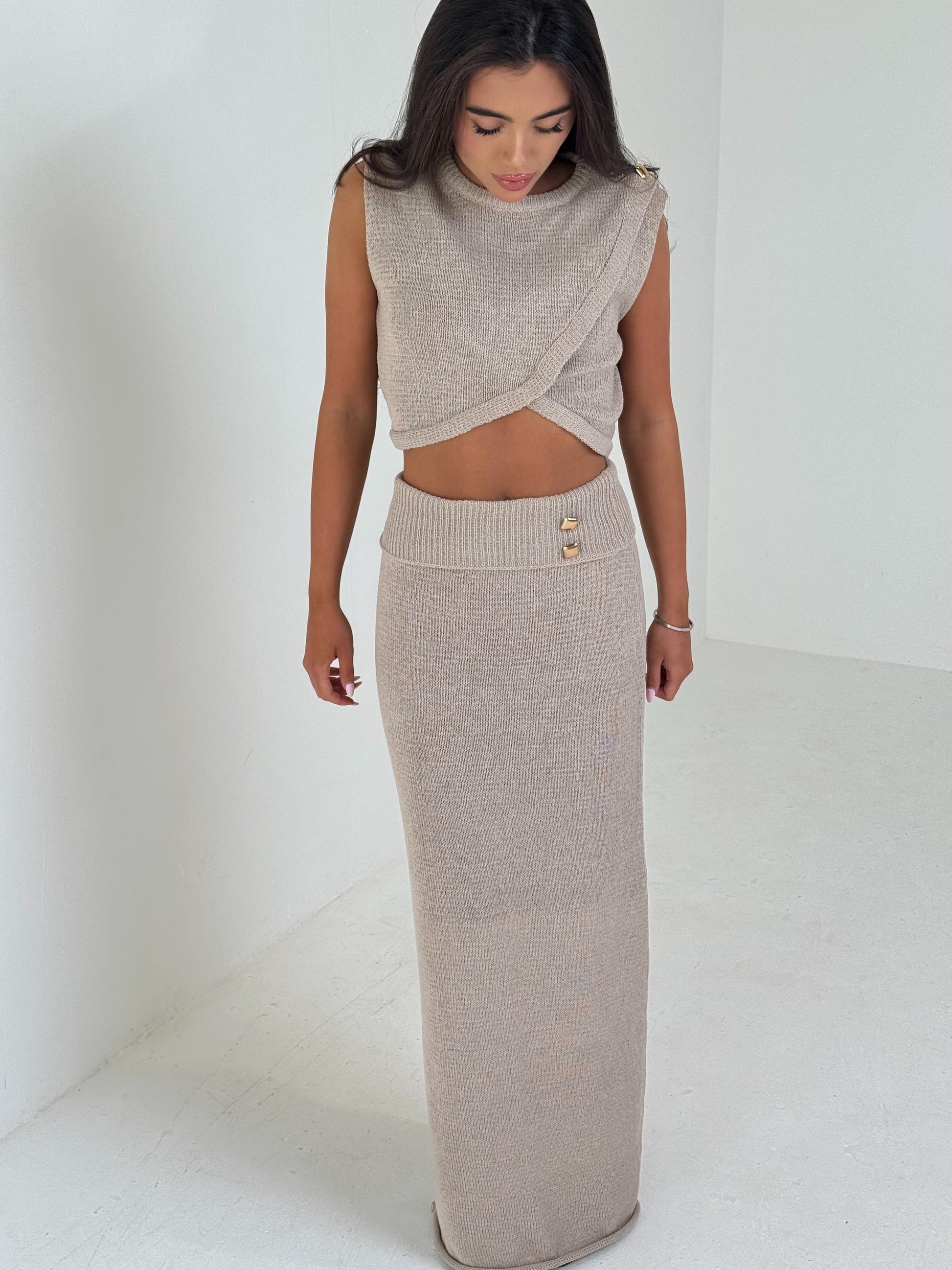 Command attention wherever you go with the LuxeFleur™ knitted maxi skirt and matching sleek crossover sleeveless top. Wrapped in irresistibly soft fabric and trimmed with striking gold accents, this set delivers unstoppable style—and comfort that moves with you. Don’t just show up. Make every entrance unforgettable.
