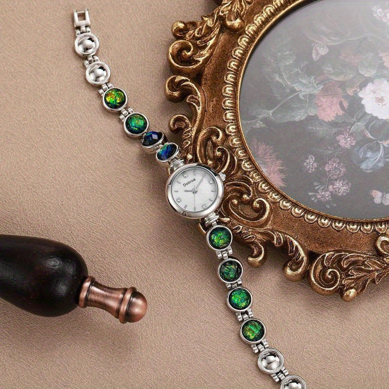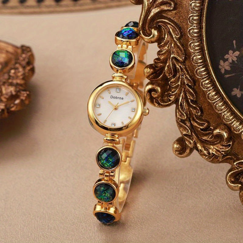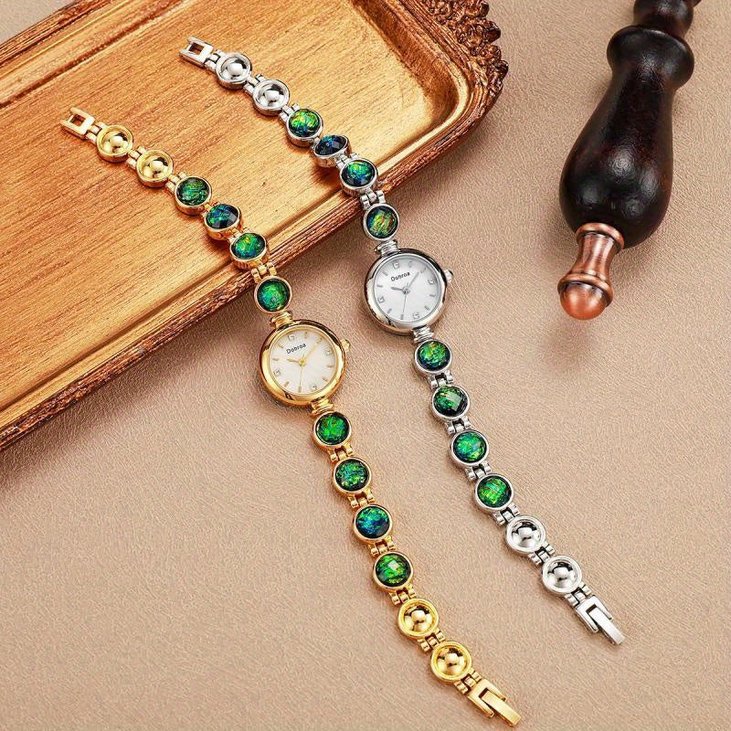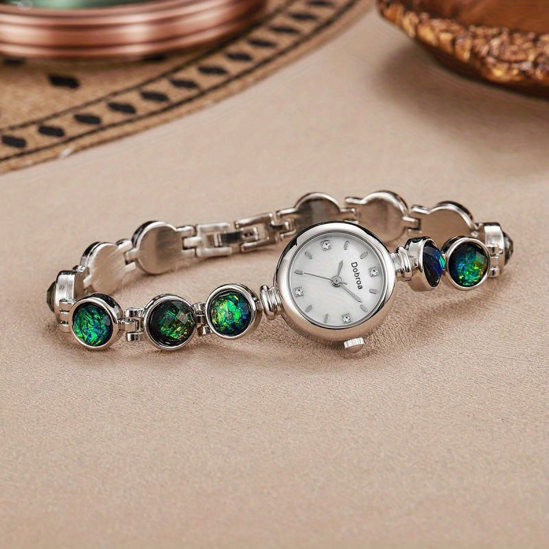 This elegant watch features faceted green opal stones with vibrant iridescence and a mother-of-pearl dial accented by crystal hour markers. Its slim, sculptural link bracelet mimics a fine piece of jewelry, designed for easy wear alone or layered with other bracelets. The fold-over clasp ensures a secure, comfortable fit.