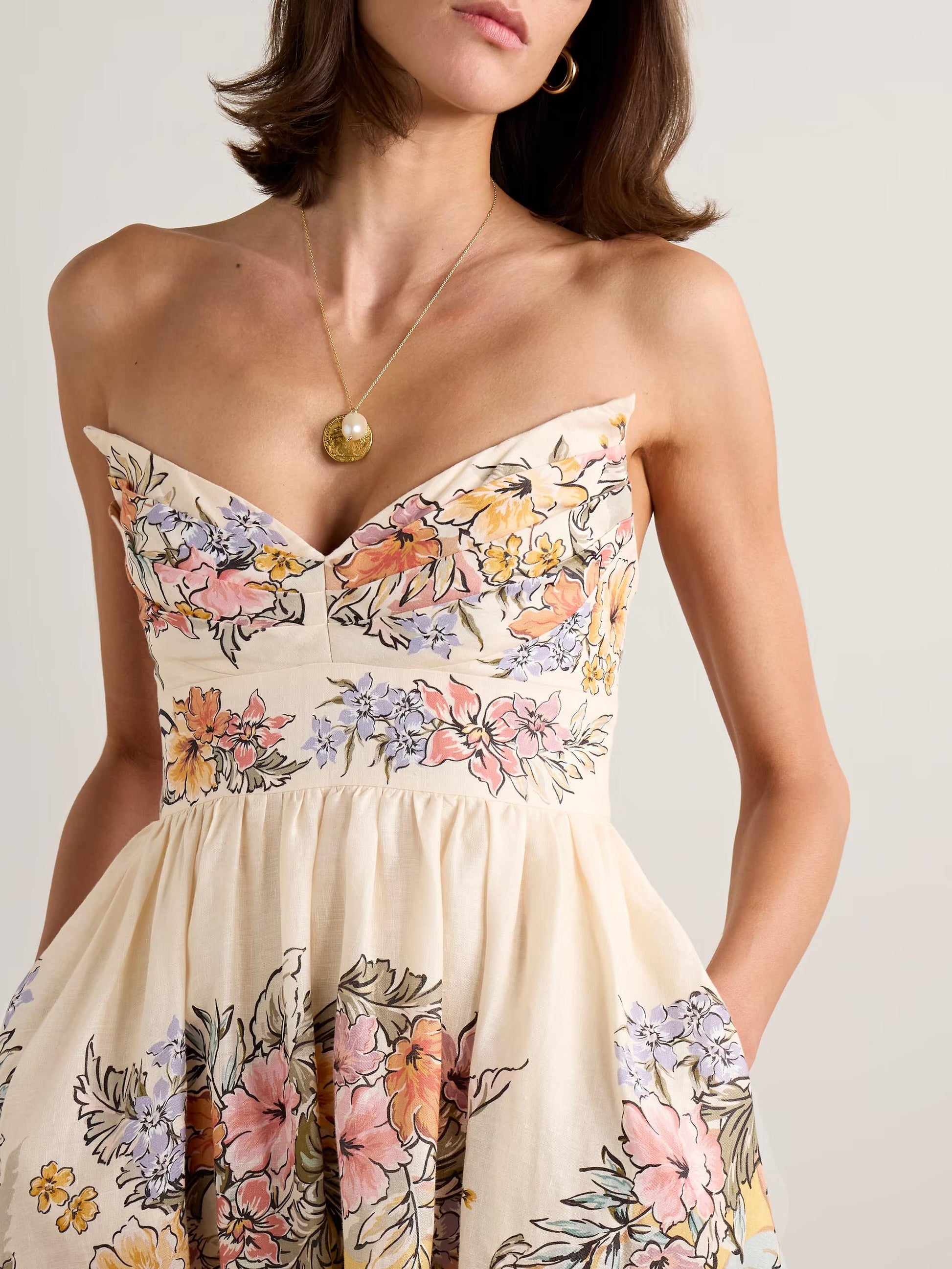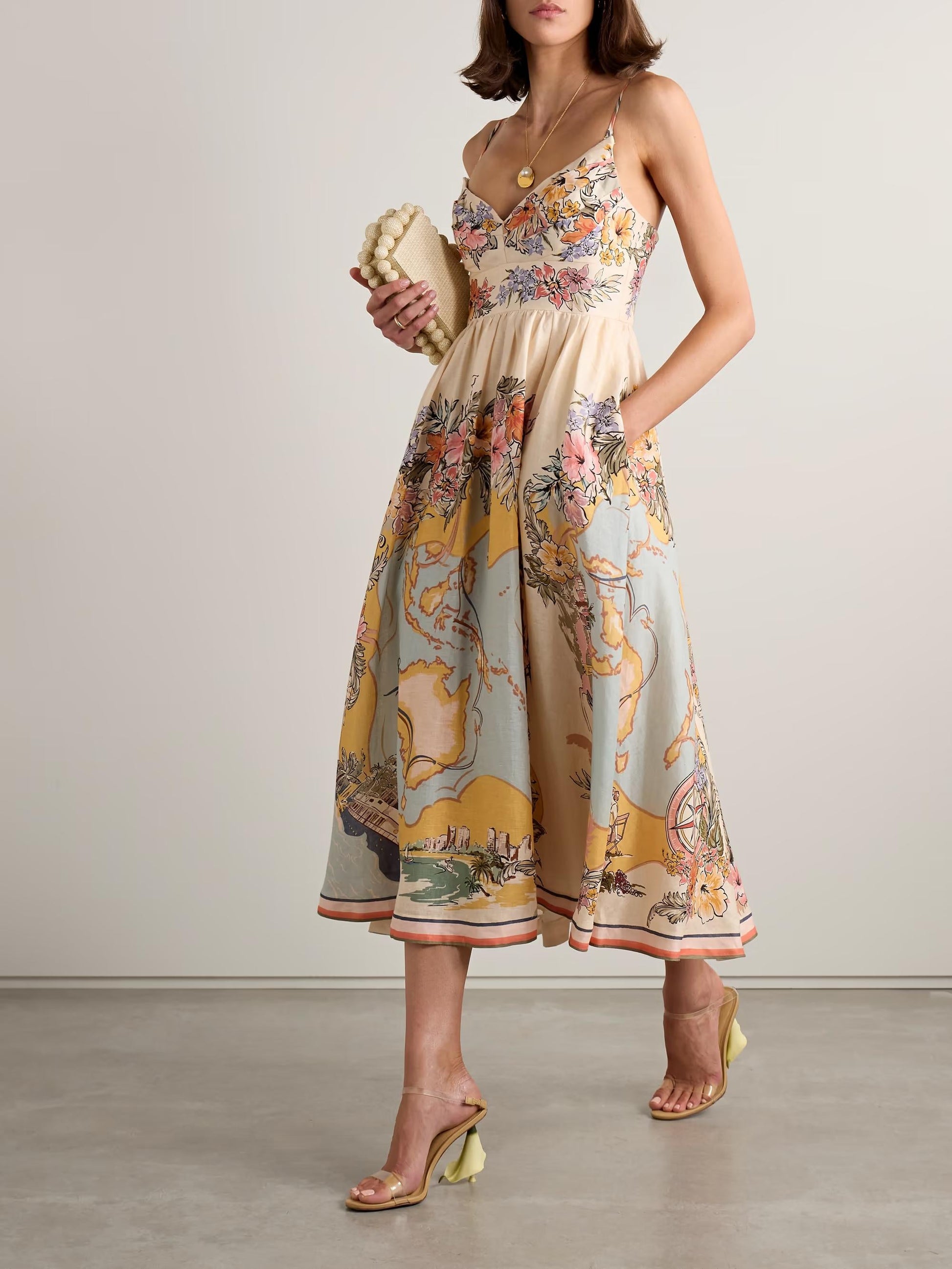Sink into the ultimate freedom of style and comfort with the Seabreeze Belle™—a breathtaking dance of vibrant beach scenes and delicate flowers that moves with your every step. Crafted from a sky-cool 50/50 linen-cotton blend, it sculpts your figure with pleated sweetheart cups and a cinched waist that flows into a midi skirt made to mesmerize. Side pockets? Yes, because effortless glam should always have an edge of practical ease.