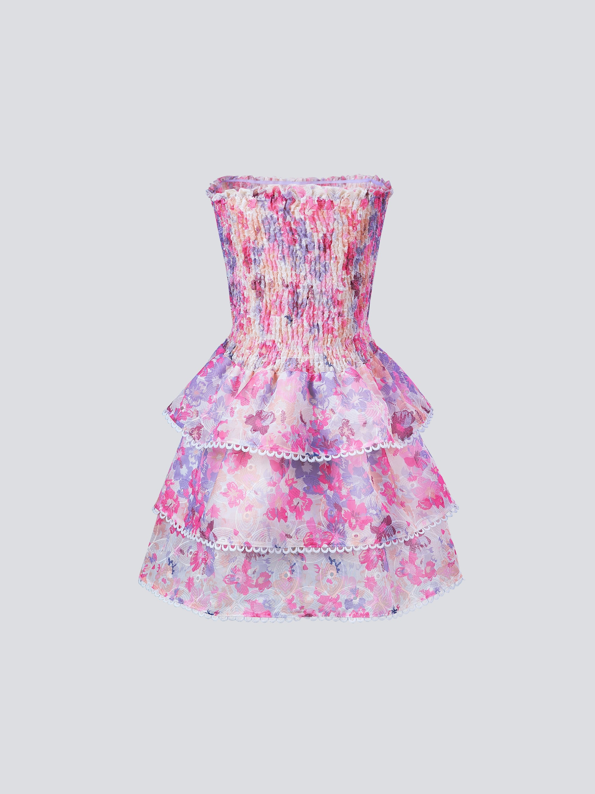 The Selene Mini Dress brings a fresh, stylish look for sunny days. Its strapless, smocked bodice offers a comfortable, flexible fit. The dress flows into a tiered floral skirt with delicate lace trim, perfect for garden gatherings, brunches, or casual outings.